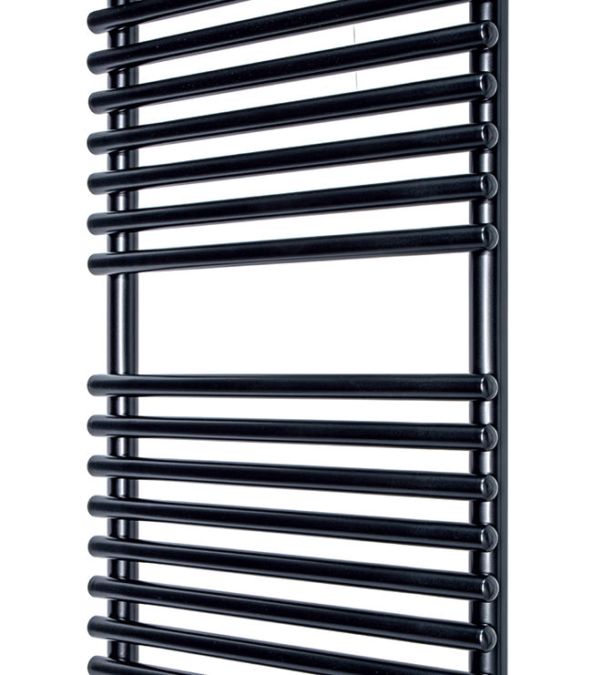 Towel warmer in carbon steel made of a horizontal elements series with 25 mm diameter welded on vertical manifolds with 35 mm diameter.