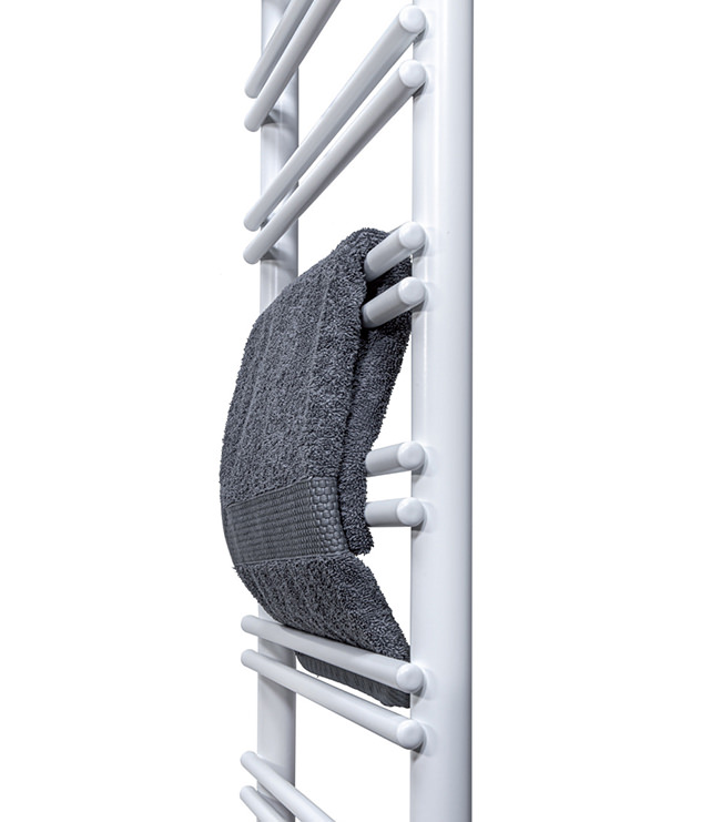 Towel warmer in carbon steel made of a horizontal elements series with 16 mm diameter welded on vertical manifolds with 35 mm diameter.
