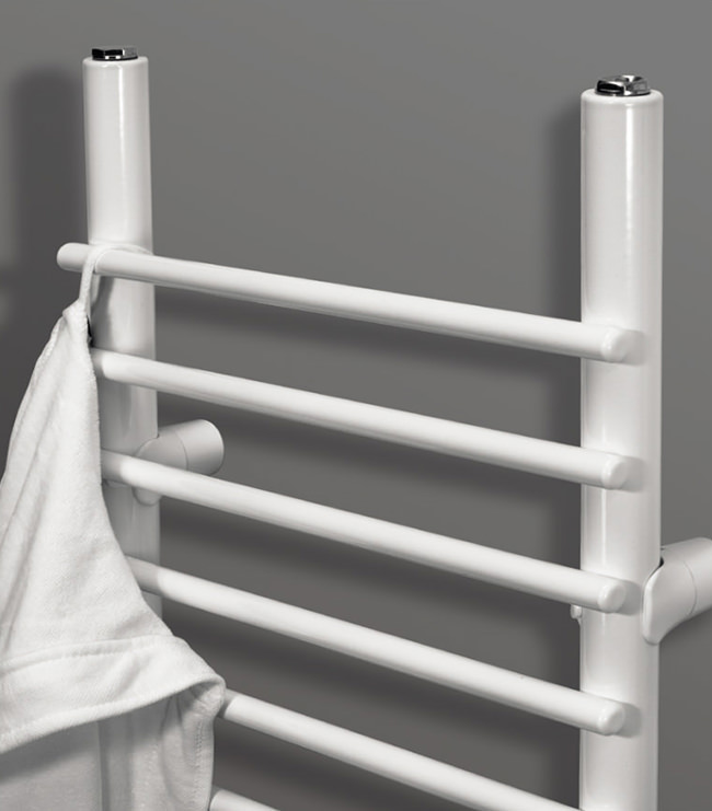 Scaldasalviette in acciaio al carbonio costituito da una serie di elementi orizzontali di diametro 16 mm saldati su collettori verticali di diametro 35 mm.