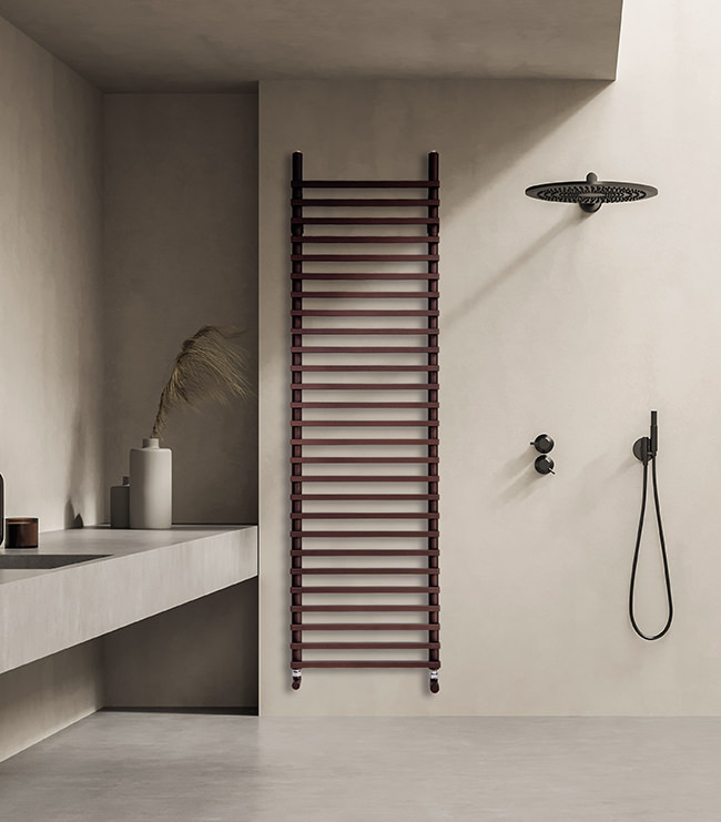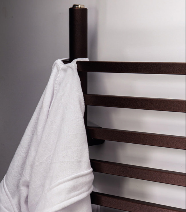 Scaldasalviette in acciaio al carbonio costituito da una serie di elementi orizzontali a sezione quadrata di 20 mm saldati su collettori verticali di diametro 35 mm.