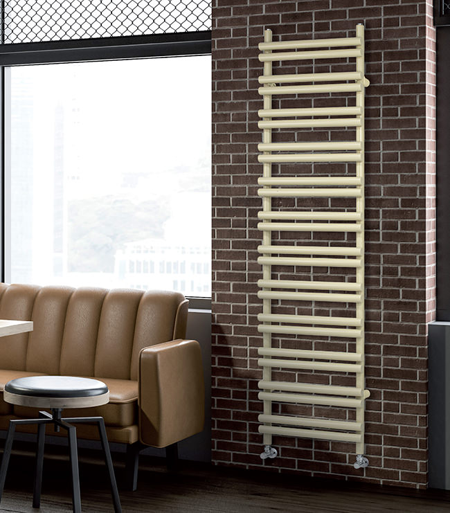 Radiator in carbon steel made of a horizontal elements series with 35 mm diameter welded on vertical manifolds with 35 mm diameter.
