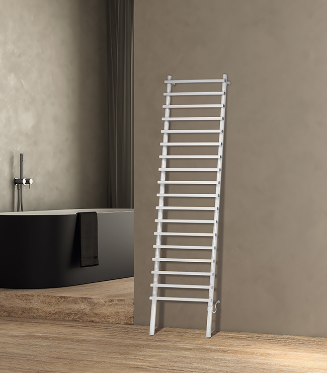 Scaldasalviette in acciaio al carbonio costituito da una serie di elementi orizzontali a sezione quadrata di 20 mm saldati su collettori verticali di diametro 35 mm.